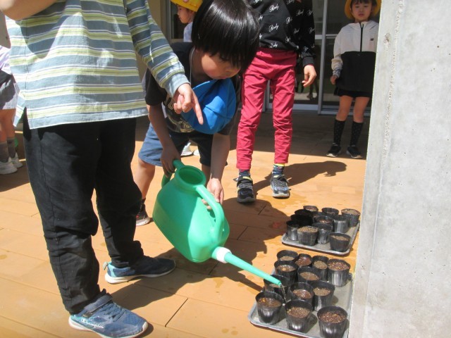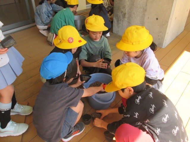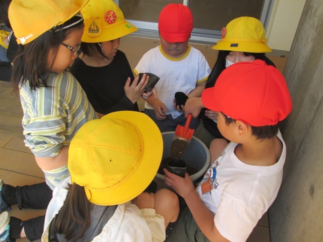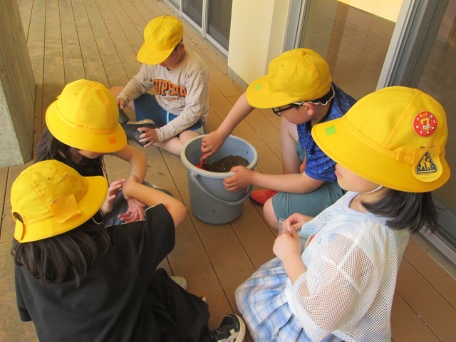 先日理科の学習で観察した種の種まきをしました。種の大きさによって、種のまき方が違うことを学習したので、「このくらいの深さでいいかな?」と確認しながら丁寧に種まきをしました。「ピーマンやオクラの実がなったら食べたいな」、「一つの種からどのくらいの実や種ができるんだろう」と興味をもって取り組んでいます。