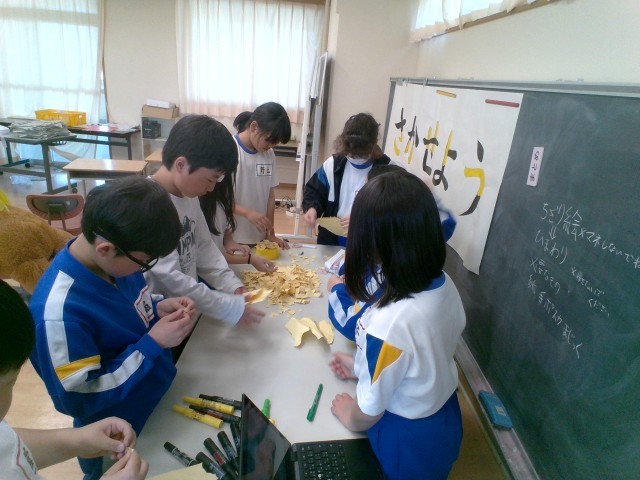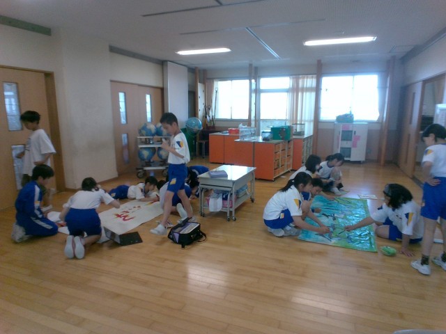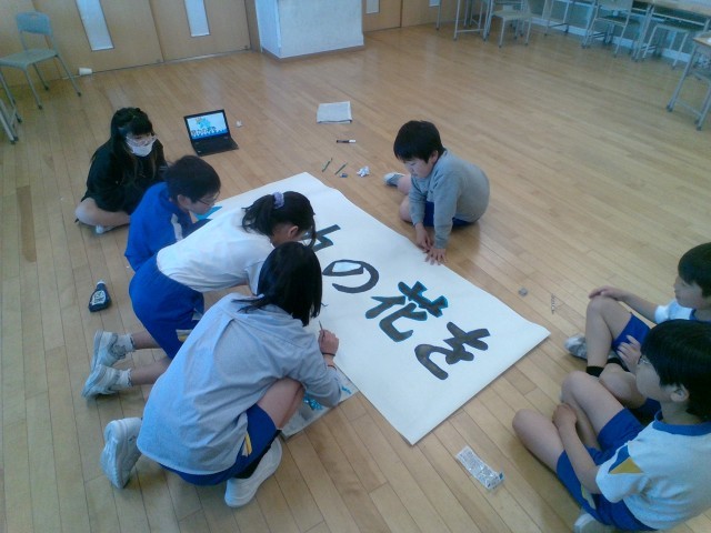 5年生では、すき間時間を使って掲示するスローガンを作成しています。どの団も個性が出ています。