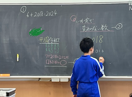 「文字を使った式」の学習をしています。 自分の言葉で話したり、書いたりしながら、学びを深めています。