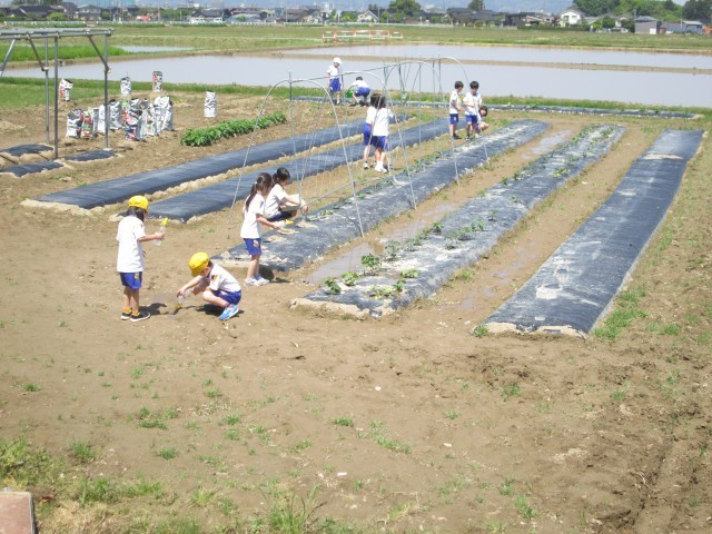 今日は、畑に何を植えたかが分かるように、看板づくりをしました。ペットボトルや段ボール等でつくるなど、いろいろ考えていましたが、できたグループから、早速看板を立ててみました。