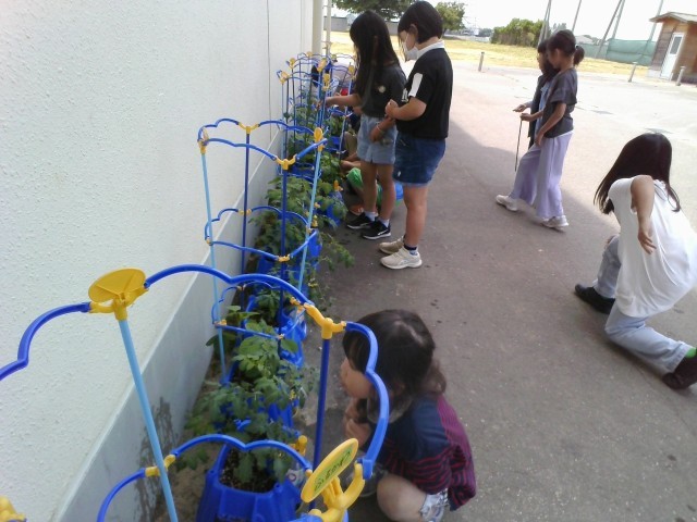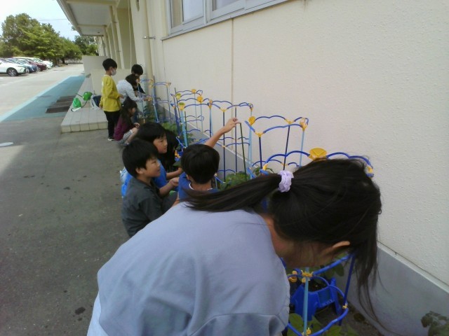 子供たちは、支柱を立てました。お世話をがんばっています。
