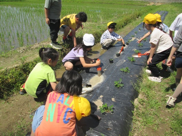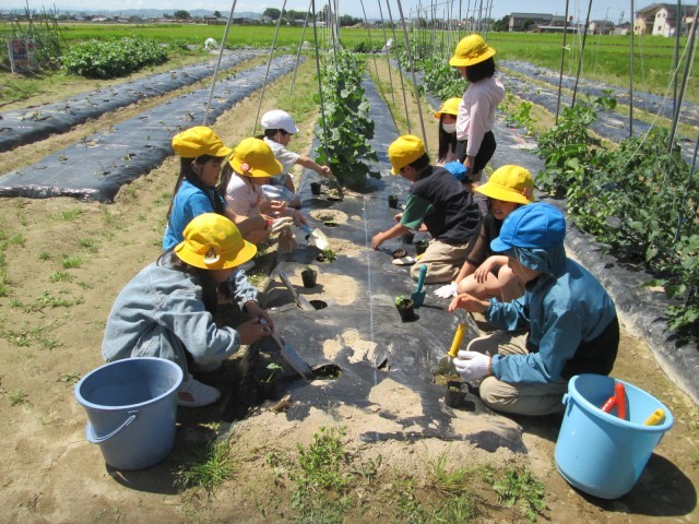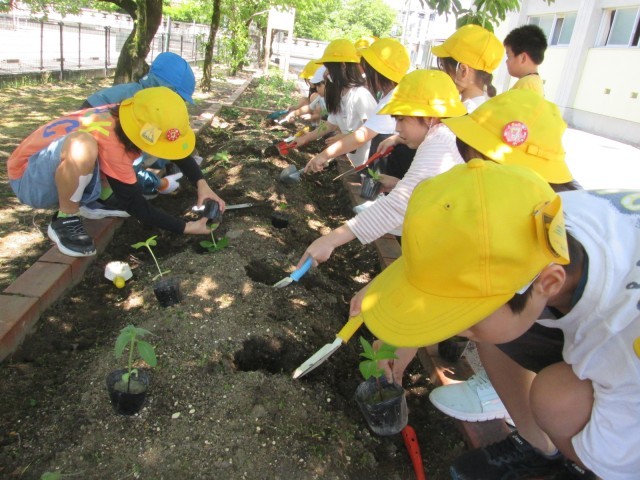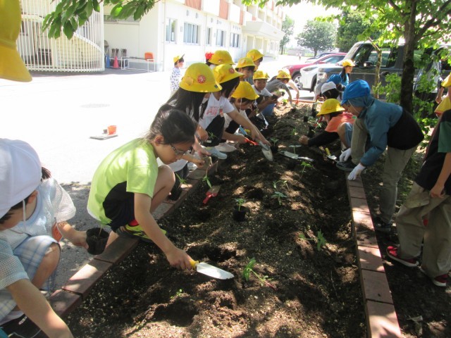 理科で栽培し観察している4つの植物を花壇と畑に植え替えました。さらに大きく育ってくれますようにと願いをこめました。