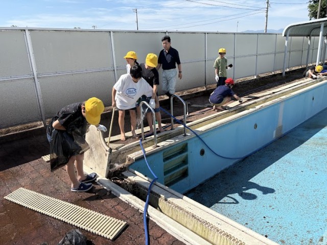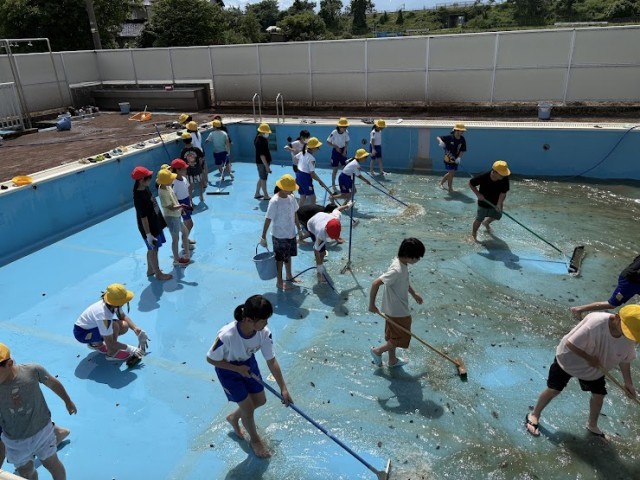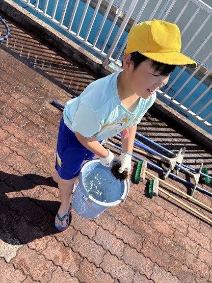 5年生は、プール清掃を行いました。側溝をきれいにして、プールの床や壁を磨きました。本気で活動する5年生いいね!