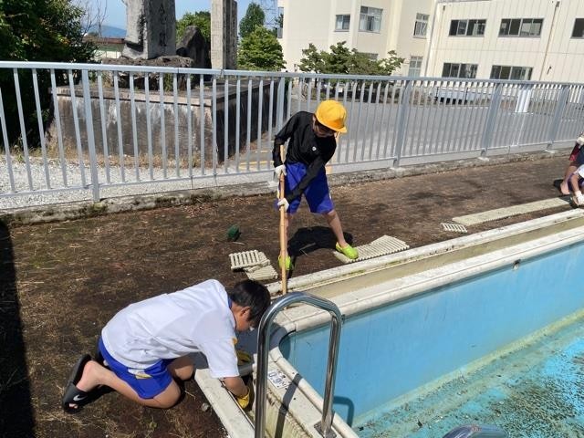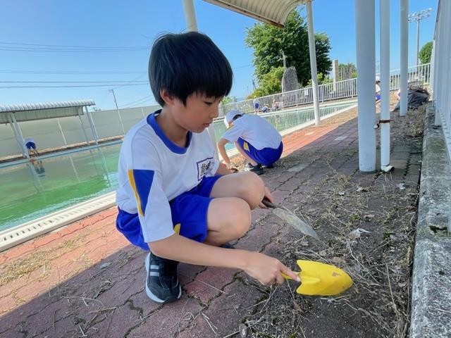 先週、プール清掃を行いました。まずは、4年生が、プールの周りの除草を担当。取りづらい草に苦戦しながらも、協力して作業を進めました。