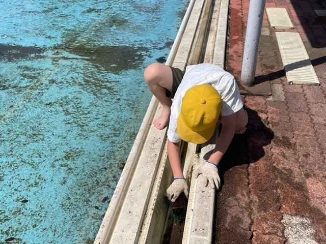 5年生は、プールサイドの側溝の汚れを磨いたり、たまった葉などを取り除いたりする作業を担当。「そっち、頼むね!」など、声をかけあう様子が素敵でした。作業がスムーズに進み、プールの中の掃除にもチャレンジしました。