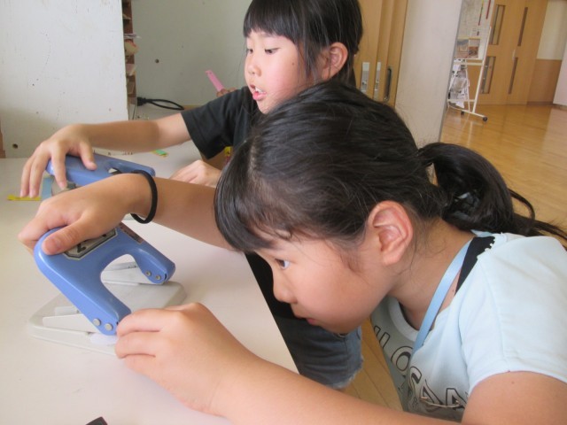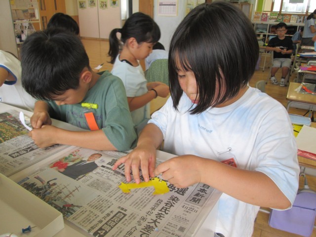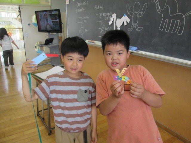 図画工作科では割ピンを使った工作にチャレンジしています。動き方の面白さを考えながら作成しています。時々失敗してしまいますが、もう一度作り直したり、失敗した部分を生かしたりしながら、根気強く取り組んでいます。