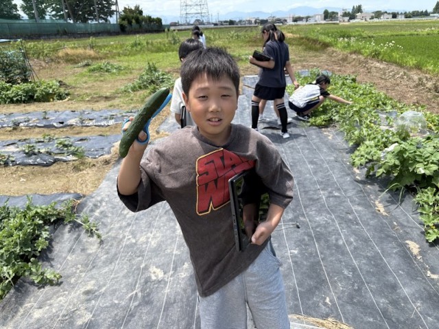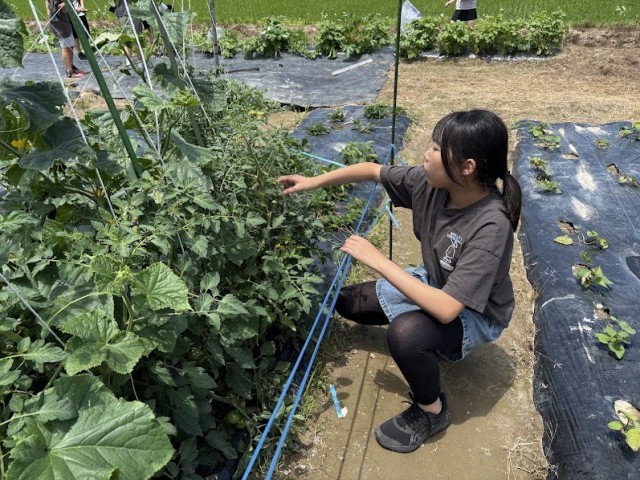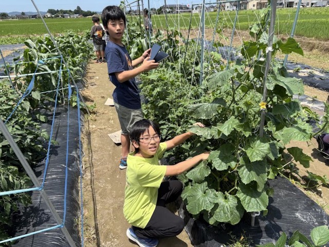5年生で育てている野菜がすくすくと大きくなっています。支柱を立てたり、ビニールをかけたりして工夫する様子が見られます。