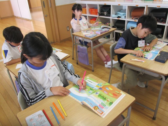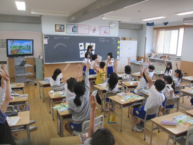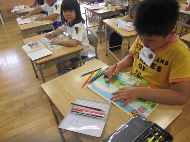 外国語活動では、すきなものを伝える学習がはじまりました。まずは、色の言い方を学びました。日本では虹を7色で表現することが多いですが、他の国では4色だったり、違う色をつかうことを知り、驚いていました。