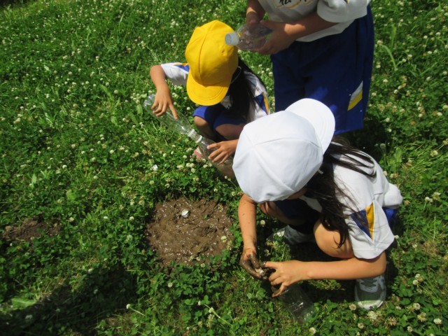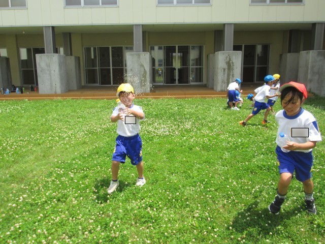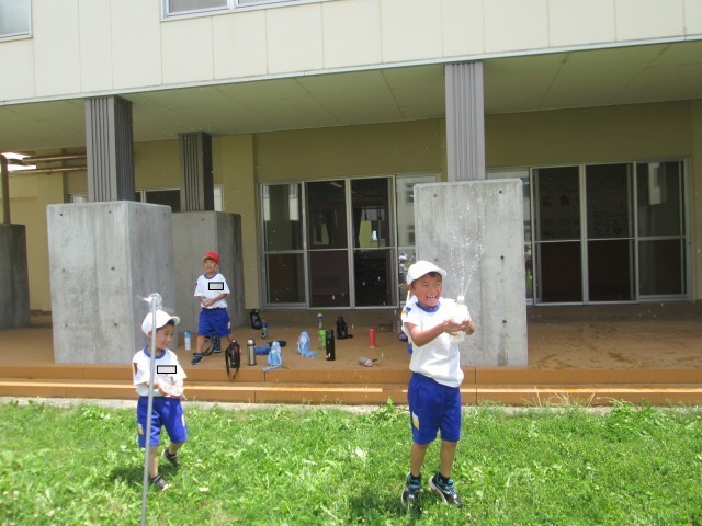 キャップに穴をあけたペットボトルで水を飛ばし遊びました。