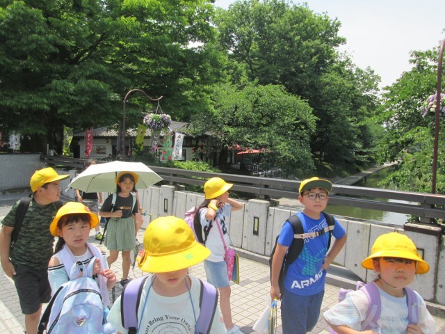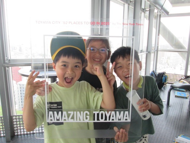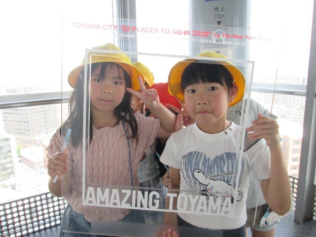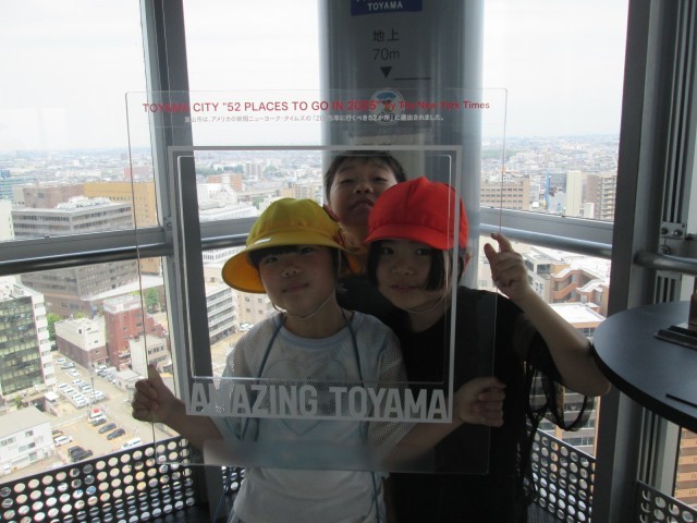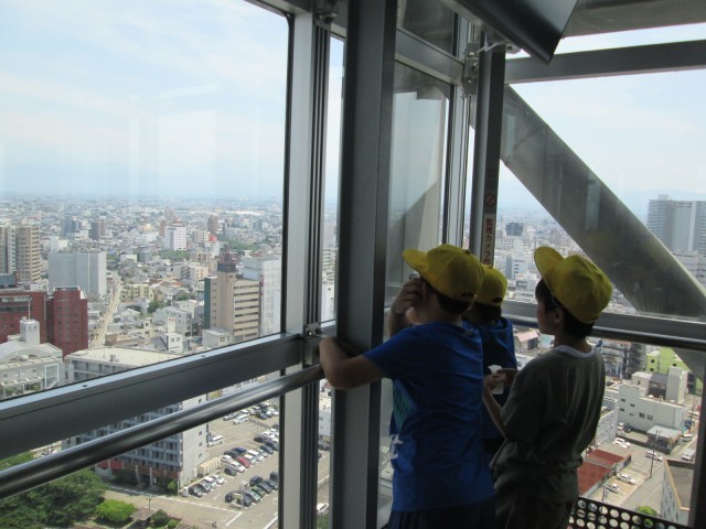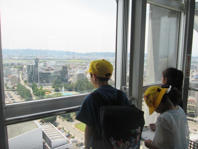 先日の学習参観で話題になった、松川の近くを通って、富山市役所展望塔へ行きました。エレベーターが開いたとたん、「わー!」と歓声が上がり、富山市中心部の様子をじっくりと見学しました。