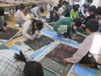 図工は、「楽しくうつして」の学習をしています。あらかじめ、ローラーで色をつけた台紙の上に、魚や動物など、思い思いに切り取ったシールを貼ります。そして、その上から黒色の版画用インクを塗り、貼ったシールを...