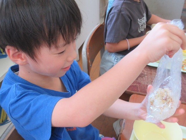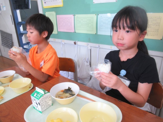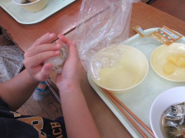 9月4日の給食は、防災献立でした。災害が起きた時には、水がとても大切になります。そのため、食器を洗わないように、ポリ袋を使っておにぎりを作りました。1年生の子供たちも、自分でおにぎりを作っておいしそうに食べていました。