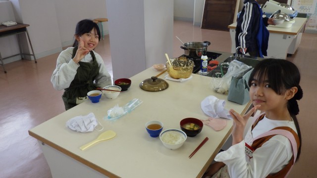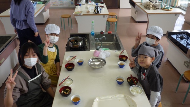 今日は調理実習でした。グループごとに選んだ出汁と味噌の組み合わせで作った味噌汁と、お米を炊いて食べました。グループごとに味の異なる味噌汁が完成して、大満足でした。グループで持ち寄った味噌汁の実もおいしく楽しみました。