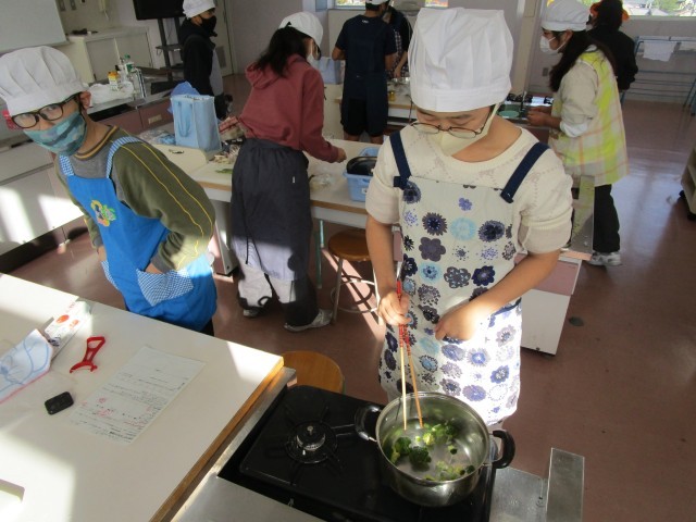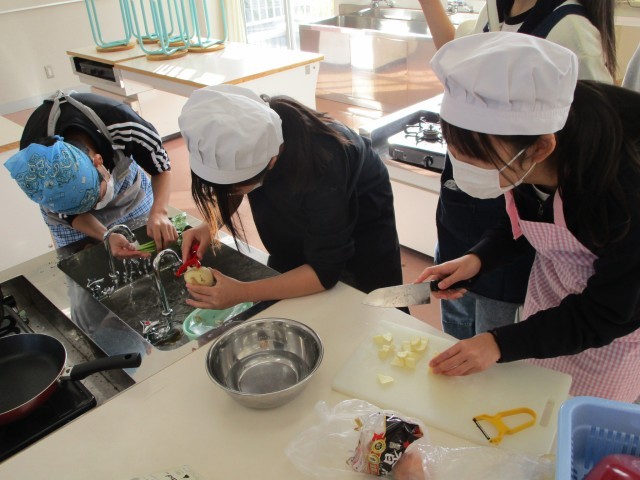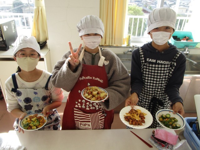 「食べてハッピー♡私たちのスペシャルメニュー」というテーマで、家族がハッピー♡になる献立を考えて実際に調理をしました。炒める、茹でる、蒸す等自分の作りたいものに合わせた調理方法を的確に選んで調理していました。