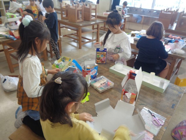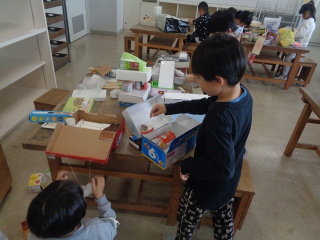 お菓子等の空き箱を使って、「ともだちハウス」を作りました。建物の形や部屋の数はどうするか、箱はどんな組み合わせにするか、よく考えていました。