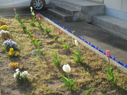 小学校は、さくらの花がちりはじめています。しかし、それにかわるように、たくさんの花が校ていにさいています。みなさんがそだてていたチューリップもさきはじめました。どれもみなさんにあえるのをたのしみにしているかのようです!先生たちもあしたみなさんにあえるのをたのしみにしています!あした、とびきりのえがおであいましょう!