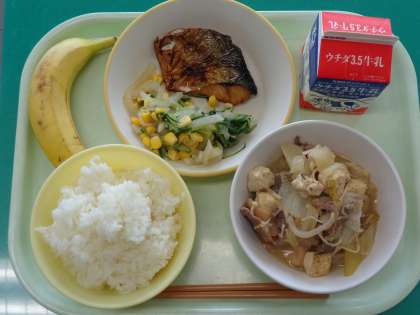今日の献立は、ご飯、牛乳、鯖の塩焼き、大根サラダ、すき焼き、バナナです。
