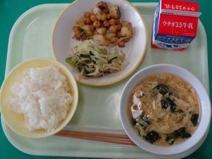 今日の給食は、ご飯、牛乳、魚と豆のえごま味噌がらめ、おひたし、かき玉汁です。