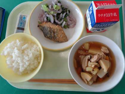 今日の献立は、ご飯、牛乳、サワラの西京焼、ゆかり和え、大和煮、のり佃煮です。