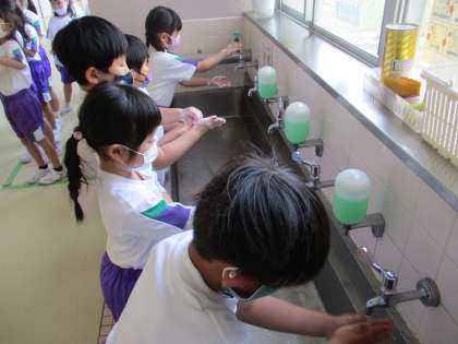 入学したばかりの1年生も、手洗いの上手な「手洗い名人」がたくさんします。