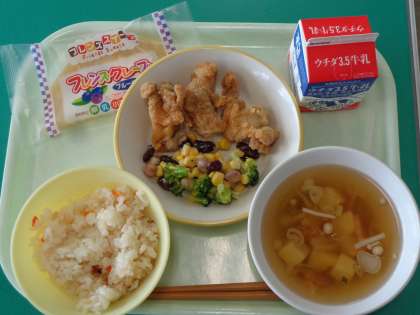 今日の献立は、ちらし寿司、牛乳、鶏肉の米粉揚げ、ビーンズサラダ、すまし汁、お祝いデザート(クレープ)です。