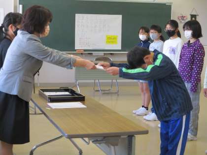 今年度は配信で行いました。任命証授与の前には児童会長が、授与式の後には委員長や学級代表が「こんな学校・委員会・学級にしたい」と、全校のみんなに意気込みを伝えました。