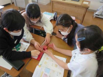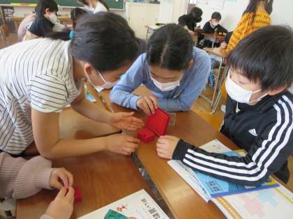 算数科の学習で、直方体と立方体のかさを比べました。1㎤のブロックを使って実際に直方体と立方体をつくる活動を通して、立方体の方が大きいということに気付きました。また、「1段目に並べたブロックが何段あるか」という考えから、体積を求める公式を導きました。