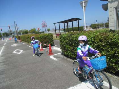 今日は、交通安全博物館で自転車安全教室に参加しました。実技練習では、一時停止でしっかり止まることや左右の安全確認の仕方などを教えていただき、安全に気を付けて練習に取り組みました。