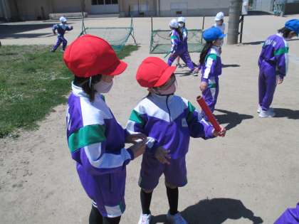 体育科の学習でリレーをしています。バトンパスの上達を目指し、先生からコツを教わったり、友達同士で教え合ったりしています。