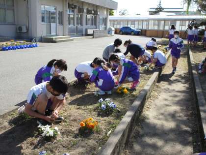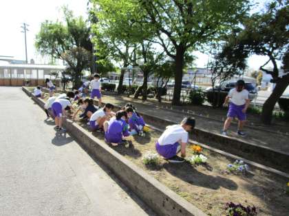 3年生は、花壇の草むしりをしています。花壇がとてもきれいになりました。