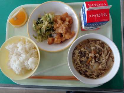 今日の献立は、ご飯、牛乳、鶏肉と高野豆腐のねぎソースかけ、チンゲンサイひたし、卵ともずくのスープ、サンフルーツです。