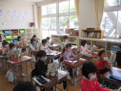 1年生は、「うたにあわせて あいうえお」の学習をしています。言葉のリズムを感じながら、友達と声を合わせて音読しています。大きな声や小さな声と、声の大きさも工夫しながら読んでいます。