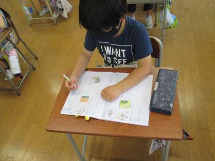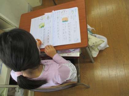 漢字の学習をしています。姿勢を正し、鉛筆の持ち方に気を付けながら、一文字ずつ丁寧に書いている様子です。