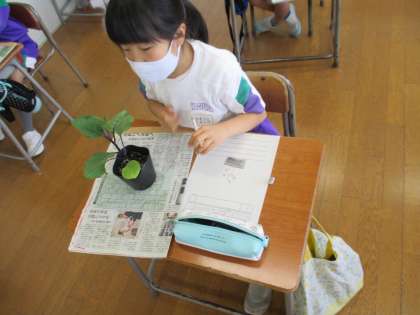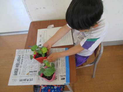 自分で決めた野菜の苗を観察したあと、鉢に植えました。今後の成長が楽しみです。