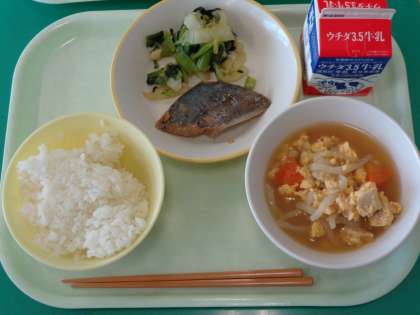 今日の献立は、ご飯、牛乳、サワラの西京焼き、おひたし、親子煮です。