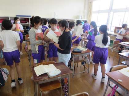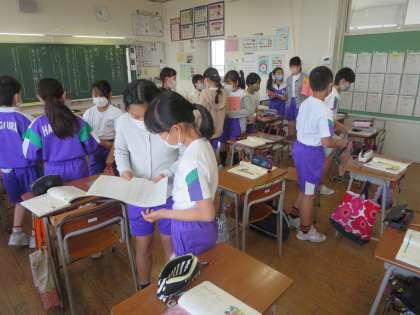 国語科「なまえをつけてよ」の学習で、教材を読んだ感想を伝え合う活動をしました。互いの感想を聞き合い、自分と同じ考えに触れたり違う考えのよさに気付いたりする様子が見られました。