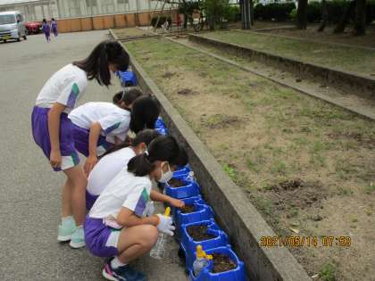 朝の「さわやかタイム」は、子供たちが主体的に委員会活動や係活動を行っています。1年生〜3年生は、生活科や理科の学習で栽培している花や野菜の水やりをしています。暖かい日が続き、3年生のホウセンカの芽が出始めてきました。