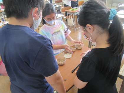 インゲンマメが発芽するための条件を調べます。実験方法を考えてグループごとに観察していきます。
