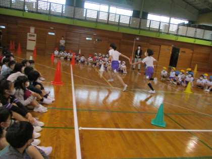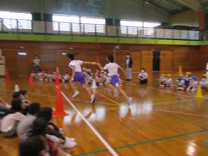 なかよしタイムに、「バトンパスのお手本を見よう」という運動委員会主のミニ集会がありました。