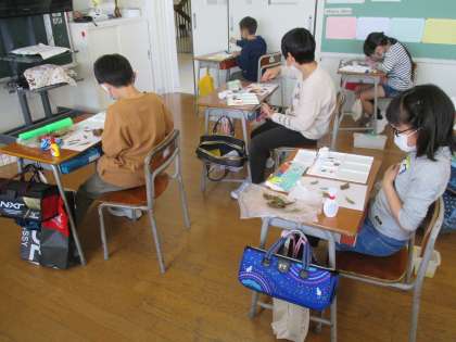 図画工作科では、校庭の葉の色や形のおもしろさ、画用紙への配置の工夫を考えました。さらに、葉の周りに描き足して、葉のすてきなところを引き出しました。友達と作品を鑑賞し合い、葉の見方が広がりました。これからも、自然物の不思議さや素晴らしさを見付ける楽しみを感じてほしいと思います。