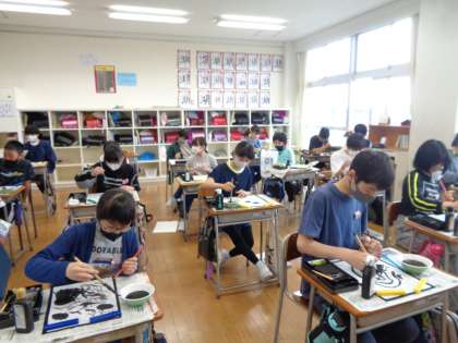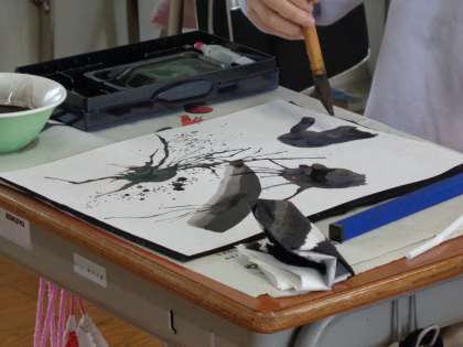 水墨画に挑戦しています。最初は、墨の濃淡を表すことがうまくいかない様子でしたが、徐々に上達してきて、ぼかしやぼかしやかすりの表現も工夫し、素敵な作品に仕上がりそうです。