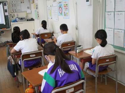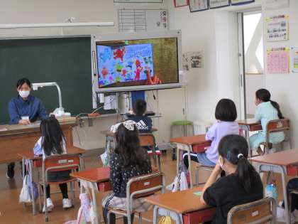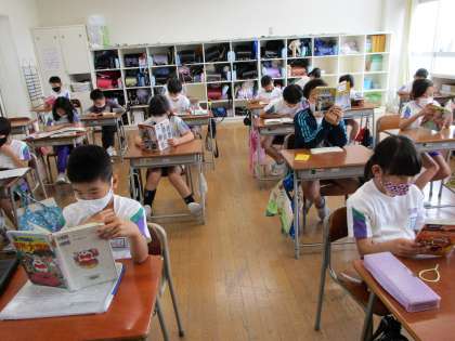 毎週、水曜と木曜のマイタイムは全校で読書に取り組んでいます。読書を通して、豊かな心を育み、読む力や想像する力を身に付けていきたいと思います。低学年では、担任が読み聞かせをしている学級もあり、子供たちはお話の世界に引き込まれていました。