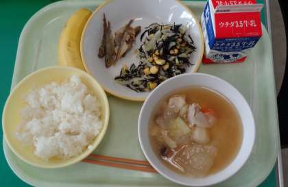今日の献立は、ご飯、牛乳、小アジの唐揚げ、ひじきのマリネ、ポトフ、バナナです。