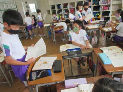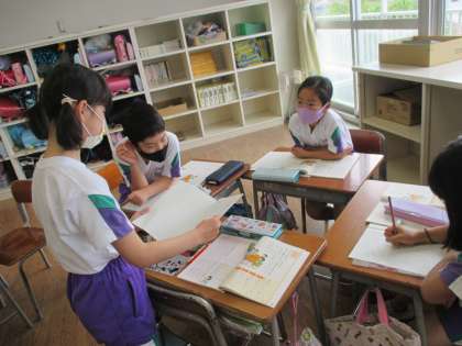 国語科の時間に、「もっと知りたい 友達のこと」という学習をしています。今日は友達に知らせたいことを、グループで発表し合いました。聞いている子供たちは、「いつ遊びに行ったのですか」「なぜ好きなのですか」など、たくさんの質問をしながら聞いていました。
