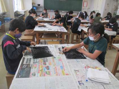 今日の図画工作は、黒色のパステルで画用紙を真っ黒に塗りつぶしてから、消しゴムで消して模様をつけました。それぞれが、できた模様から思いをふくらませ表現活動を楽しむ様子が見られました。