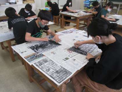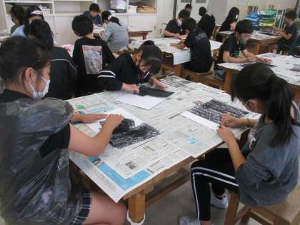 今日の図画工作は、黒色のパステルで画用紙を真っ黒に塗りつぶしてから、消しゴムで消して模様をつけました。それぞれが、できた模様から思いをふくらませ表現活動を楽しむ様子が見られました。