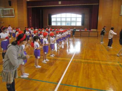 初めての応援練習、6年生のお兄さんお姉さんの話を聞いて、一緒に練習をがんばっています。覚えた応援の言葉をクラスでも楽しそうにつぶやいています。