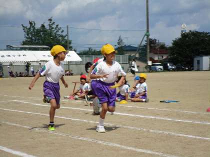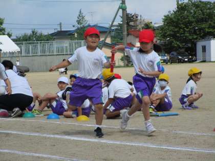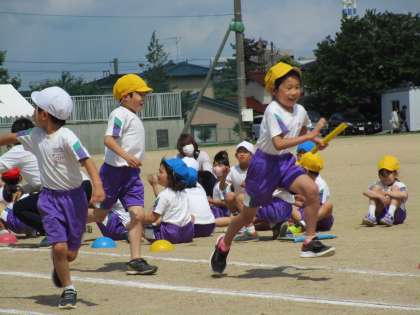 2年生の学年リレーです。力いっぱい走って、記録更新を目指します。バトンの受け渡しも上手になりました。
