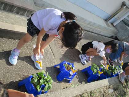 教室でランドセルを片付けた子供から、アサガオの水やりをしています。
