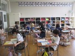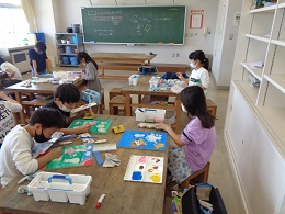 図画工作科では、コリントゲームを作っています。今は、土台になる板に好きな絵を描いています。完成するのをとても楽しみにしており、毎時間集中して取り組んでいます。